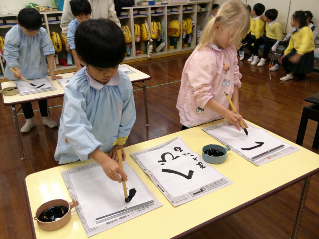 園長先生から筆の持ち方、墨汁がポタポタ垂れないように筆先を整えること、筆は立てて真っすぐ持つことなどのお約束を聞きました。