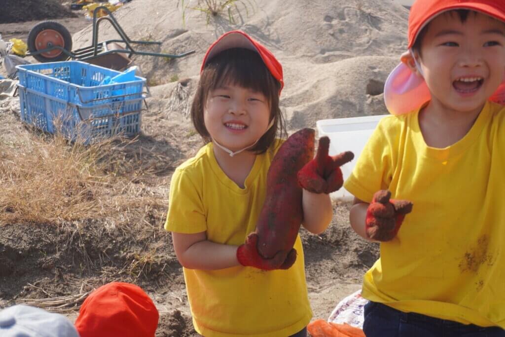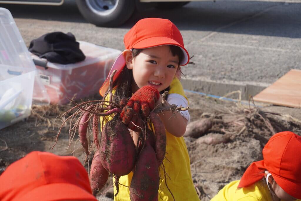 ここにお芋が隠れてる!と顔を出したお芋を一生懸命掘ったり、「大きなお芋取ったよー!」「大きいね!びっくり!」とにこにこで見せてくれて、畑は笑顔で溢れていました^^