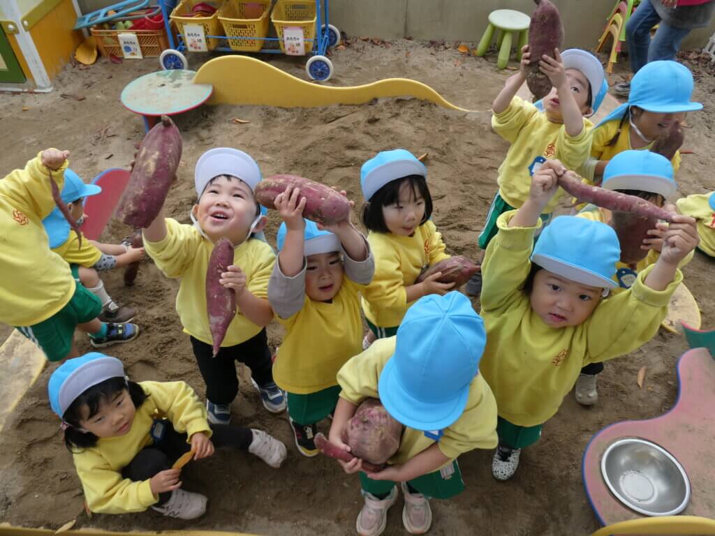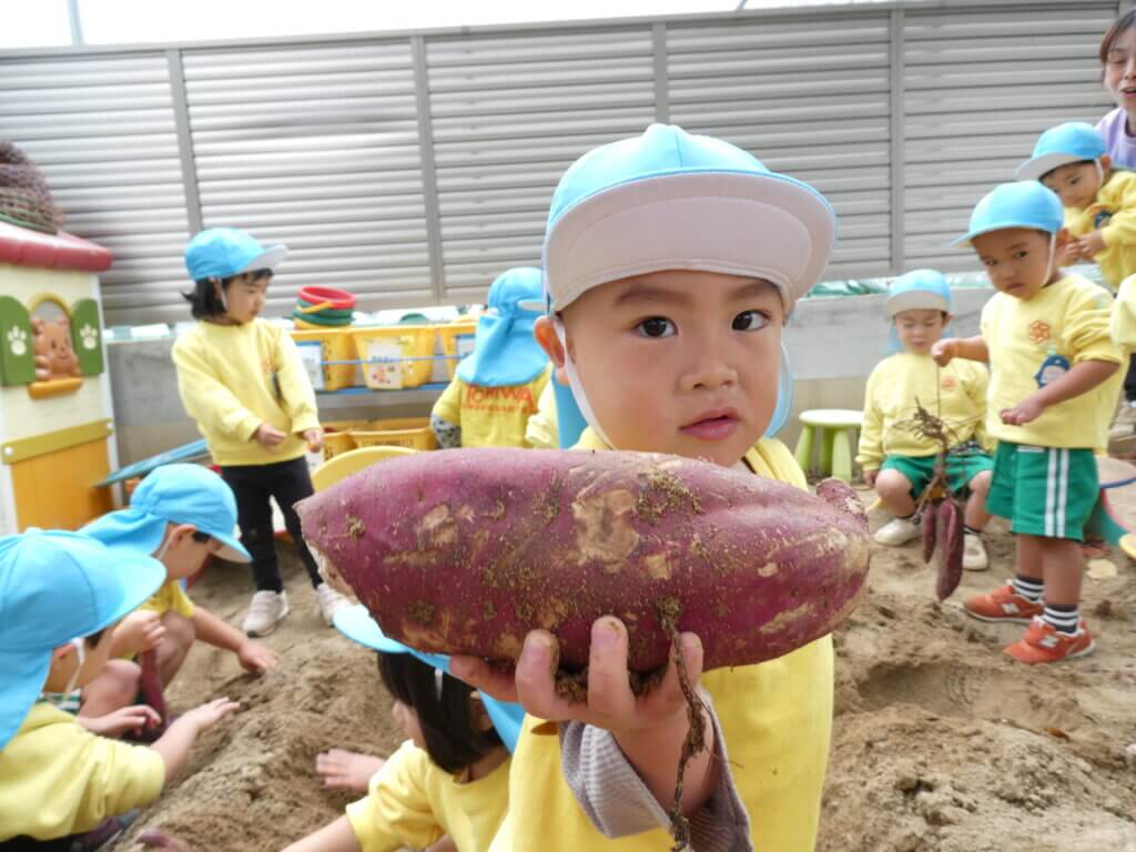 幼稚園の砂場の中から、お芋を見つけて大喜び!小さなお手てで大きなお芋を持ち上げ、お家に持ち帰る時も力持ちのぺんぎん組でした☆