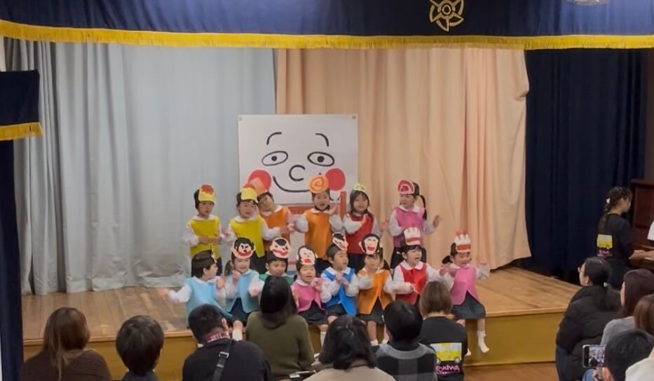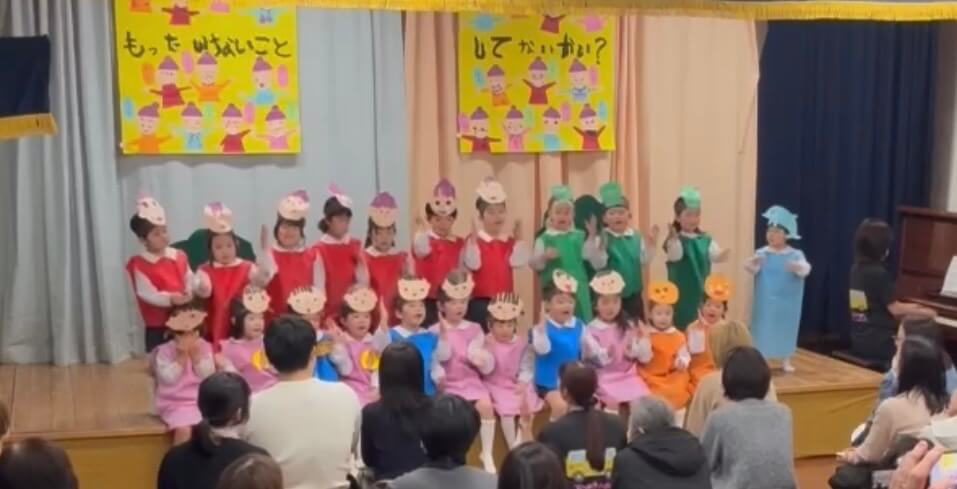 次は年中のひまわり組さん。劇は「もったいないばあさん」です。役になりきり、表情や動きも工夫しながら発表する姿が印象的でした。劇中のダンスはどの学年も真似して踊る程大人気でした!