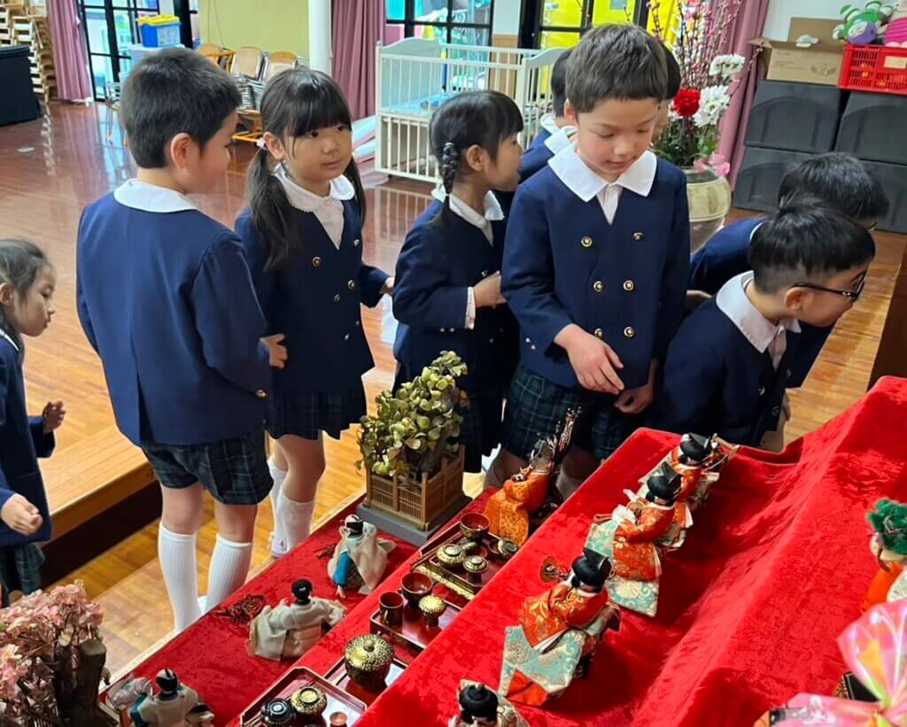 雛人形を見ながら先生の話を聞いて、女の子の健康や幸せを願う日ということや、お人形ごとの役割を知り、手に持っているものや表情の違いに興味津々でした。